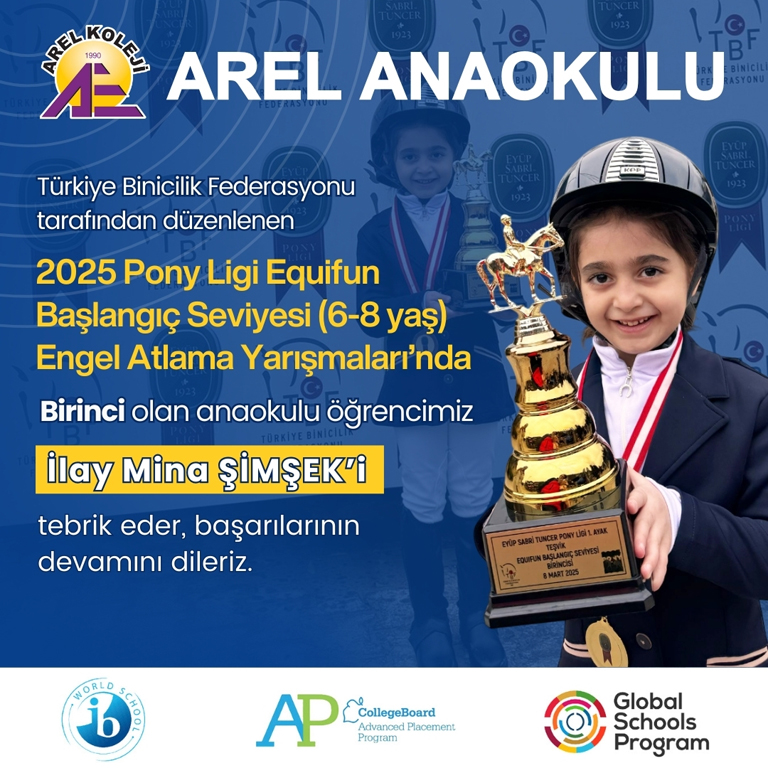Anaokulu öğrencimiz İlay Mina Şimşek, Türkiye Binicilik Federasyonu tarafından düzenlenen 2025 Pony Ligi Equifun Başlangıç Seviyesi (6-8 Yaş) Engel Atlama Yarışmaları’nda birincilik elde etti.