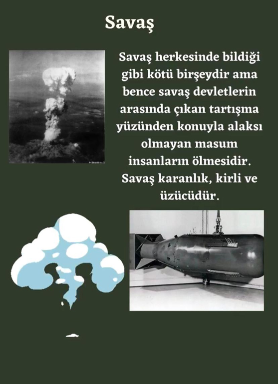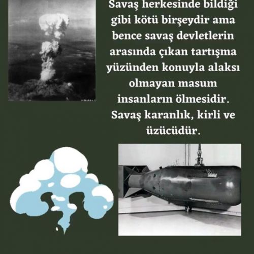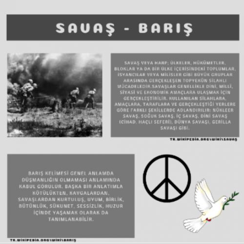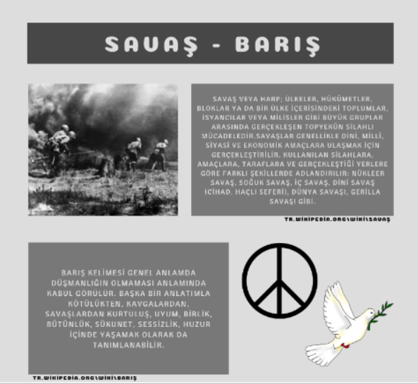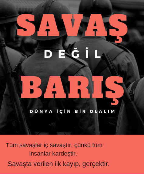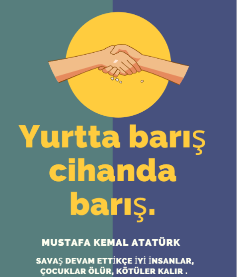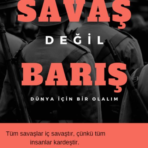 7. Sınıf öğrencilerimiz "Barış Dolu Bir Dünya" ünitesinde yurt ve dünya barışı konulu afişler tasarladılar. Türk ve dünya edebiyatından savaş ve barış temalı şiirleri araştırdılar. Barış dolu bir dünya için farkındalık oluşturdular.