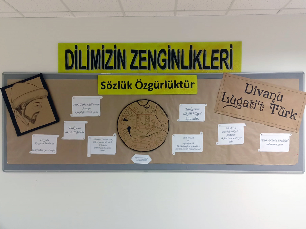 “Dilimizin Zenginlikleri” Projesi kapsamında ocak ayı çalışmaları “Dîvânu Lugati’t Türk” adlı eserle yapılmıştır. Türkçenin ilk sözlüğü olan eser ile ilgili pano çalışması yapılmış, eğitici video içerikleriyle de öğrencilerimizin eseri tanımaları amaçlanmıştır.
