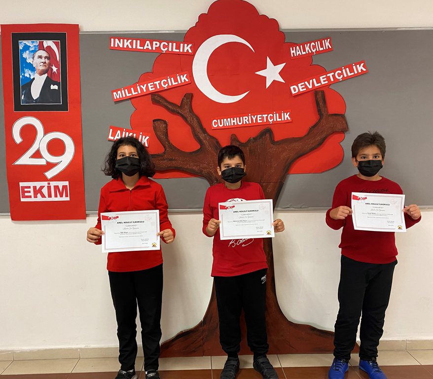 Cumhuriyetimizin 98. Yılı Etkinlikleri kapsamında İlkokul 4.sınıf öğrencilerimiz Yusuf Nakış, Mehmet Ata Kaya ve Eda Kaya okulumuzda düzenlenen “Cumhuriyet” konulu şiir yarışmasında dereceye girerek sertifikalarını aldılar. Öğrencilerimizi kutluyoruz.