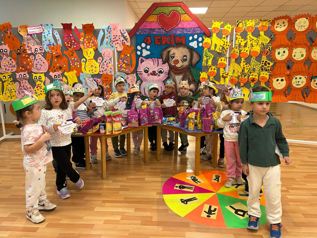 4 Ekim Hayvanları Koruma Günü kapsamında anaokulu öğrencilerimiz, hayvan sevgisini ve doğa bilincini pekiştirmek için keyifli bir hafta geçirdi. Miniklerimiz hayvan maskeleri tasarladı, resimler çizdi, hikayeler dinledi ve sokak hayvanları için düzenlenen mama toplama kampanyasına katıldı. Etkinliklerin sonunda her öğrencimiz, “Hayvan Dostu Sertifikası” ile farkındalıklarını taçlandırdı.