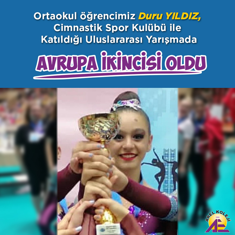 Ortaokul öğrencimiz Duru Yıldız, jimnastik spor kulübü bünyesinde takım olarak katıldıkları Bulgarian Open Agg İnternational Competition adlı uluslararası yarışmada 2. olarak Türk bayrağını gururla dalgalandırdı. Öğrencimizi ve takımını tebrik ediyor, başarılarının devamını diliyoruz.