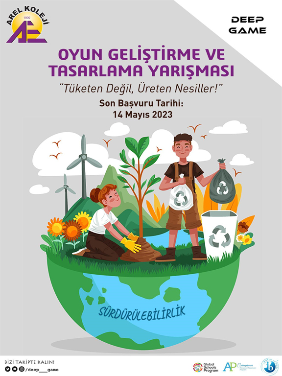 "Tüketen Değil, Üreten Nesiller!" düşüncesinden yola çıkarak AREL Koleji Teknoloji bölümü Deep Game Takımı olarak bu yıl ilkokul, ortaokul ve lise kategorilerinde ikincisini düzenlediğimiz Oyun Geliştirme ve Tasarlama Yarışması ile katılımcı öğrencilerin yazılım ve tasarım becerilerini işbirliği içerisinde kullanmaları ve "Sürdürülebilirlik” temasına uygun dijital oyunlar üretmelerini hedefliyoruz. Bu doğrultuda tüm okullarımızı yarışmamızda katılımcı olarak aramızda görmekten mutluluk duyacağız.