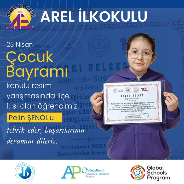 23 Nisan Ulusal Egemenlik ve Çocuk Bayramı konulu resim yarışmasında İlkokul 4. sınıf öğrencimiz Pelin ŞENOL İLÇE BİRİNCİSİ oldu. Öğrencimizi kutlar başarılarının devamını dileriz.