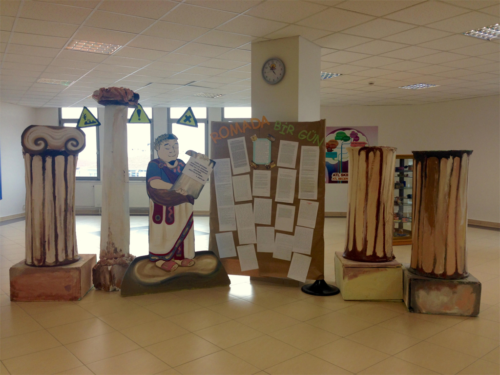 9. sınıf öğrencileri MYP alanlar arası ünite çalışmalarını yaptılar. Tarih dersinde Roma uygarlığını, Türk dili ve edebiyatı dersinde ise hikâye yazma aşamalarını öğrendiler. Öğrendiklerini birleştirerek “Roma’da Bir Gün” adlı hikâye yazma çalışmasını yaptılar. Görsel sanatlar dersinin de katkısıyla hikâyelerini sergilediler.