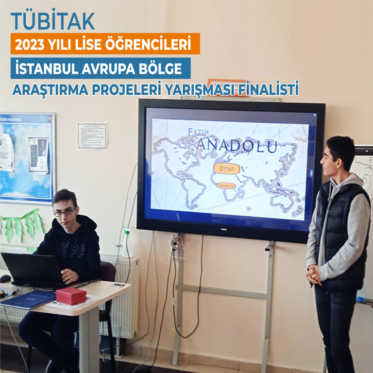 Tübitak 2023 Lise Öğrencileri Araştırma Projeleri Yarışması’nda Tarih alanında öğrencilerimiz Levent Ahmet ve Tuna Erdem Akçay "Tarih Öğretiminde Zaman ve Mekân Algı Becerisinin Harita ve Eğitsel Bilgisayar Oyunu ile Destekleyerek Geliştirilmesine Yönelik Örnek Bir Çalışma "Fetih: Anadolu" adlı projeleriyle İstanbul Avrupa Bölge Finalistleri arasına girmeye hak kazandılar.