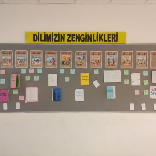 Dilimizin Zenginlikleri Projesi kapsamında ortaokul öğrencilerimiz ocak ayı boyunca “Anlamını Bul, Hatırlatmaca, Dede Korkut Hikâyeleri’nden Hareketle Yeni Bir Hikâye Yazma” gibi etkinlikler yaptılar. Dede Korkut Hikayeleri’ni çok seven öğrencilerimiz, okudukları hikâyelerdeki güzel sözleri, atasözü ve deyimleri derledi ve çalışmalarını panoda sergilediler.