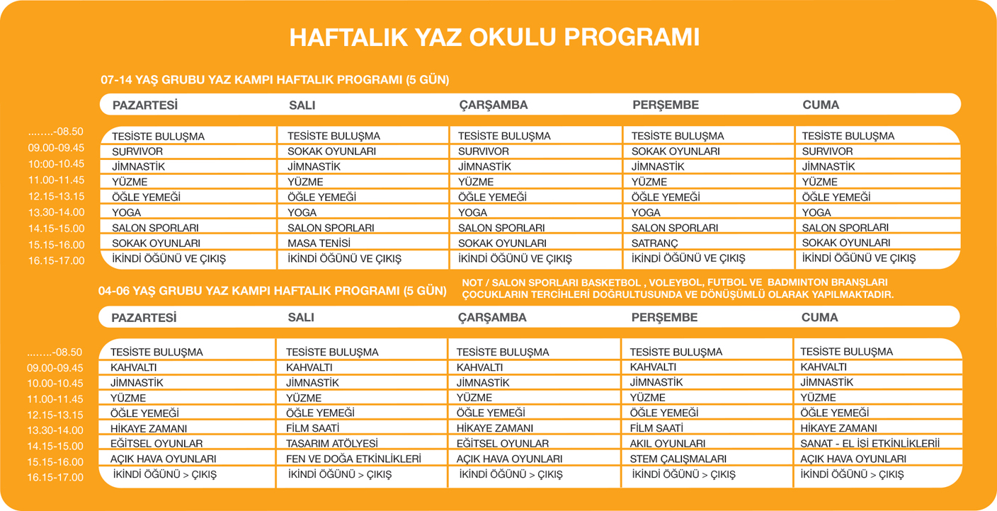 Yaz Spor Okulumuzda 04-06 ve 07-14 yaş aralığı olmak üzere iki farklı yaş grubuna hizmet verilmektedir.
